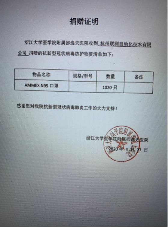 自新冠肺炎疫情爆發以來,杭州聯測自動化有限公司累積向邵逸夫醫院捐贈1020只N95醫用口罩,為當地的抗疫一線的醫護人員提供一份保障。